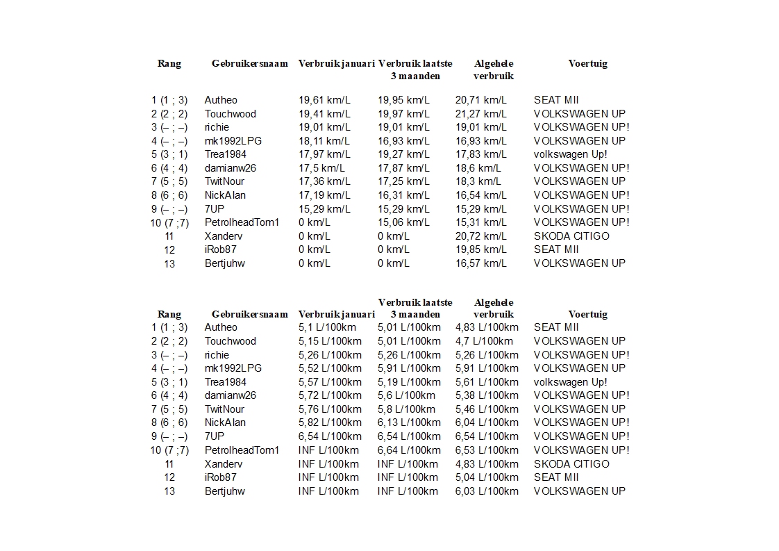 Door de binnenkomst van drie nieuwe deelnemers, zien we direct wat leuke verschuivingen. Twee van de drie laten direct zien, dat ze van zuinig rijden houden! Eén daarvan is zelfs een LPG rijder. Ik ga er vanuit, dat de literopgave dan ook voor hem LPG betreft. En voor zover ik weet, is LPG iets minder krachtig dan benzine, waardoor je er iets meer van verbruikt. Een binnenkomer op plek 4 lijkt me daarmee een hele mooie prestatie!