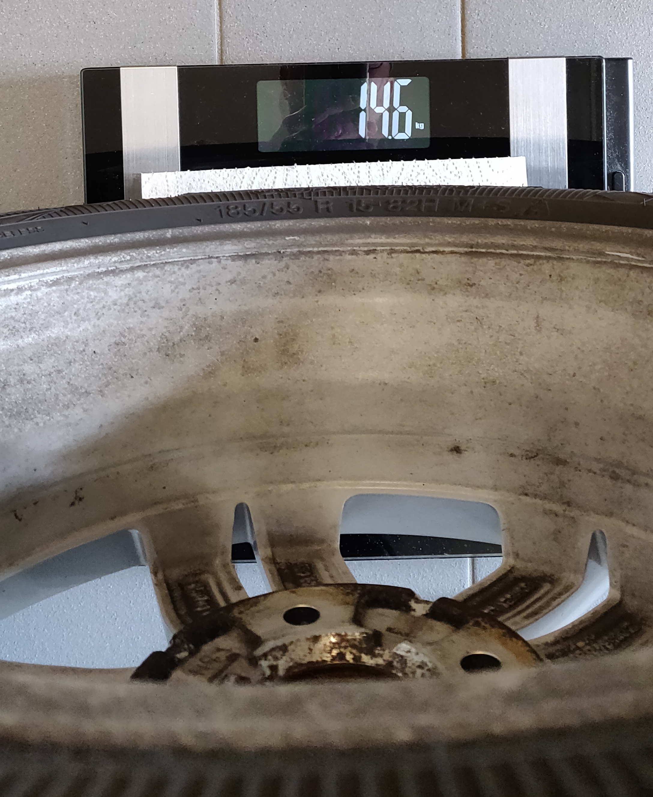 Oude velgen, Vw velg Radial; 5,5 inch breed x 15 inch in diameter, ET getal 41, gewicht 14,6 kg (Vredestein quatrac5 in 185/55)