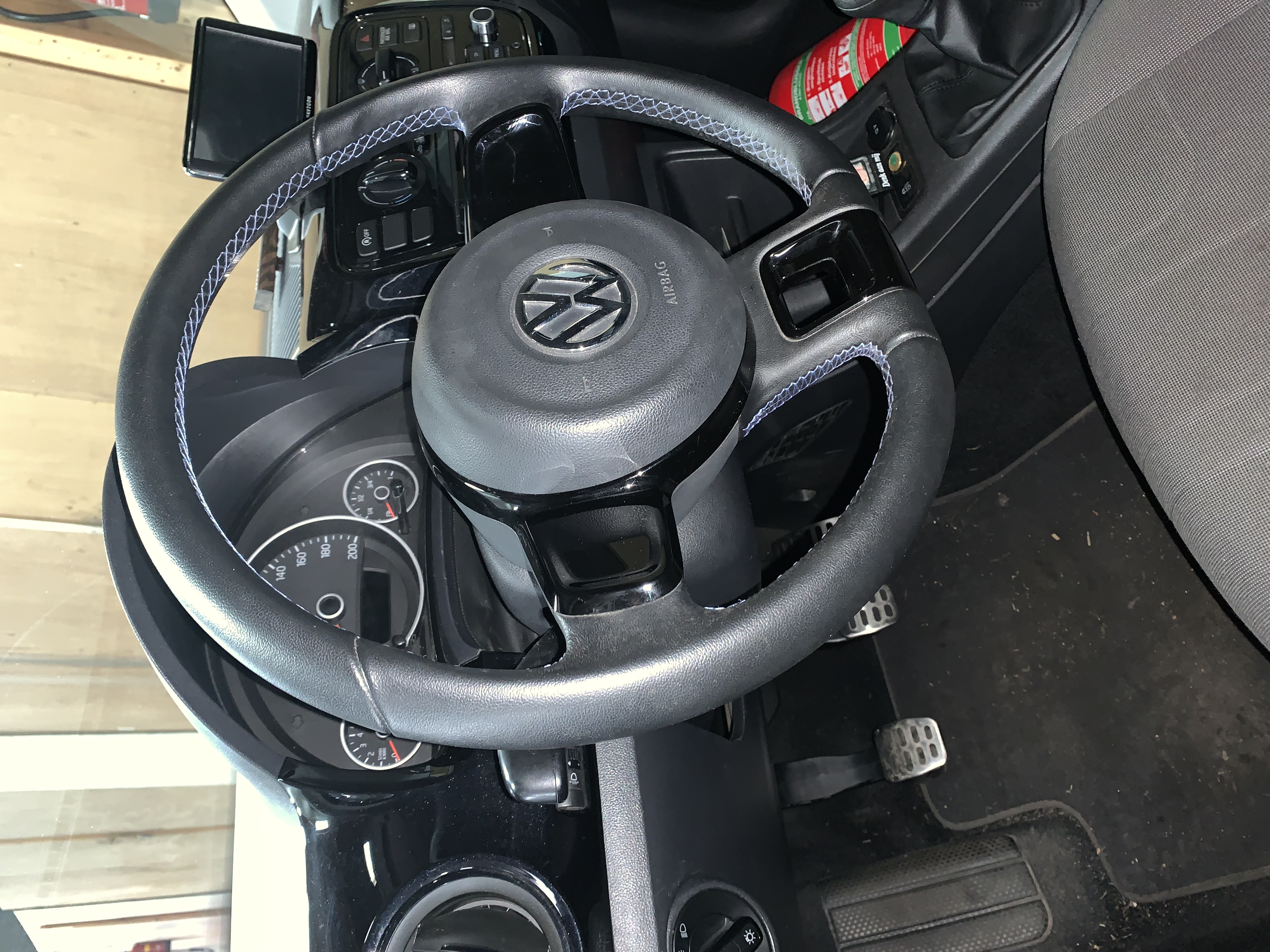 Vandaag gescoord, leren stuurwiel met blauwe stiksels
