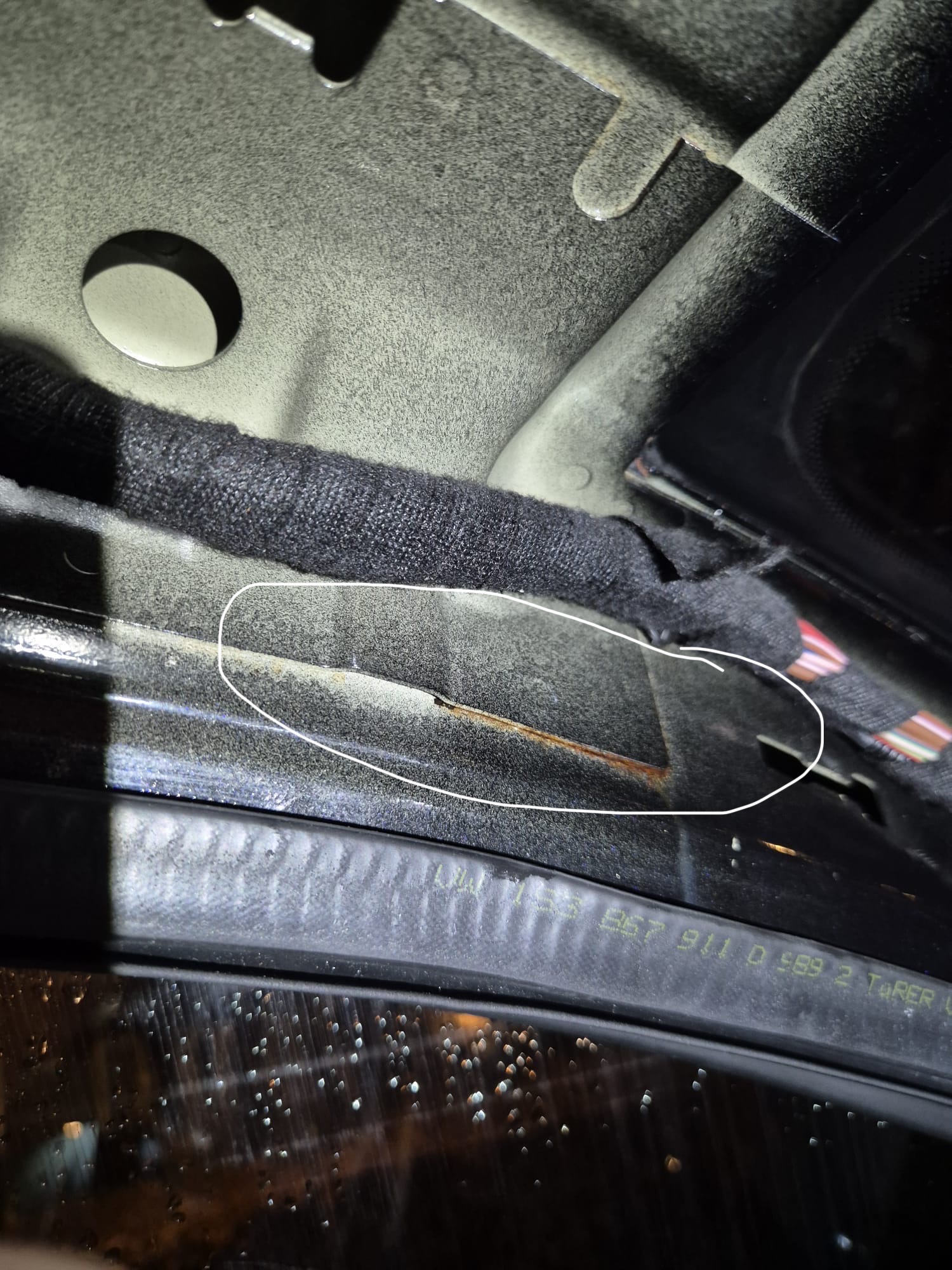Het lijkt mij dat deze foto gemaakt is bij de hoek A-stijl en voorruit. In mijn eerdere post gaf ik aan dat er sprake was van een productiefout. Aangezien op de foto iets een bruine (roest)rand laat zien lijkt het mij voor de hand liggend dat dit de productiefout is en waarbij de kit laag lek is en door de rijwind het via de carrosserie binnenkomt?