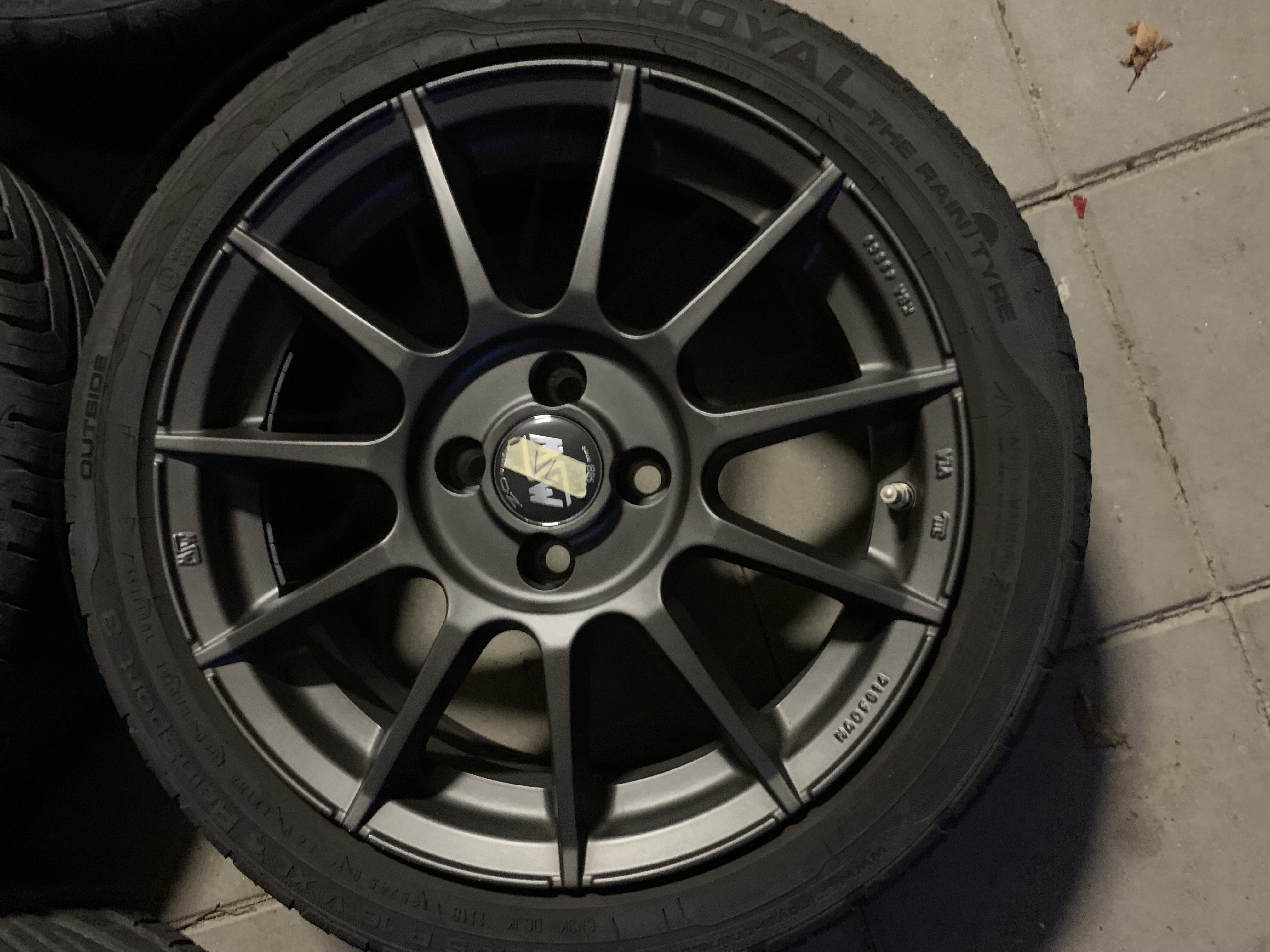 Specs van de velgen/banden : MSW 85 16 inch Gun metal Grey. 7.2kg. Uniroyal Rainsport 3 195/45R16 (worden opgereden en vervangen door Michelin)
