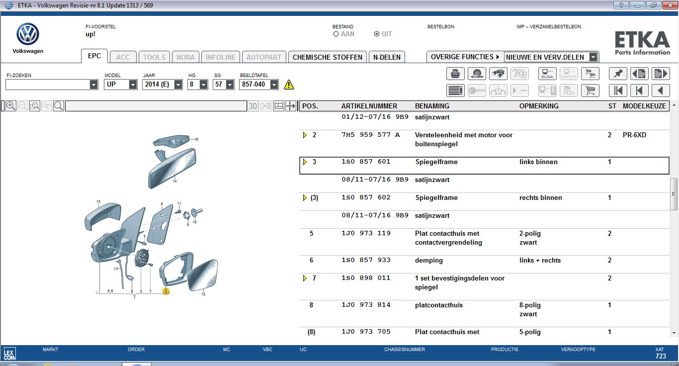 Toen ik terugkwam bij mijn geparkeerde up bleek een onverlaat de bestuurder buitenspiegel flink aangereden te hebben. De kapotte spiegel (12) zelf lag op straat. De bevestiging van de rand (3) aan het huis (5,6) is er nog alleen rechts want het linker bevestigingspalletje was afgebroken. Daardoor kiert de rand (3) links een beetje. Spiegel vervangen kosten 72 euro. Alles werkt daarna. Herstel van de rand (3) eist een geheel nieuw huis (1) ca. 3-4 honderd euro. Wil daar vanaf zien. Zie voor de nummers onderstaande tekening.