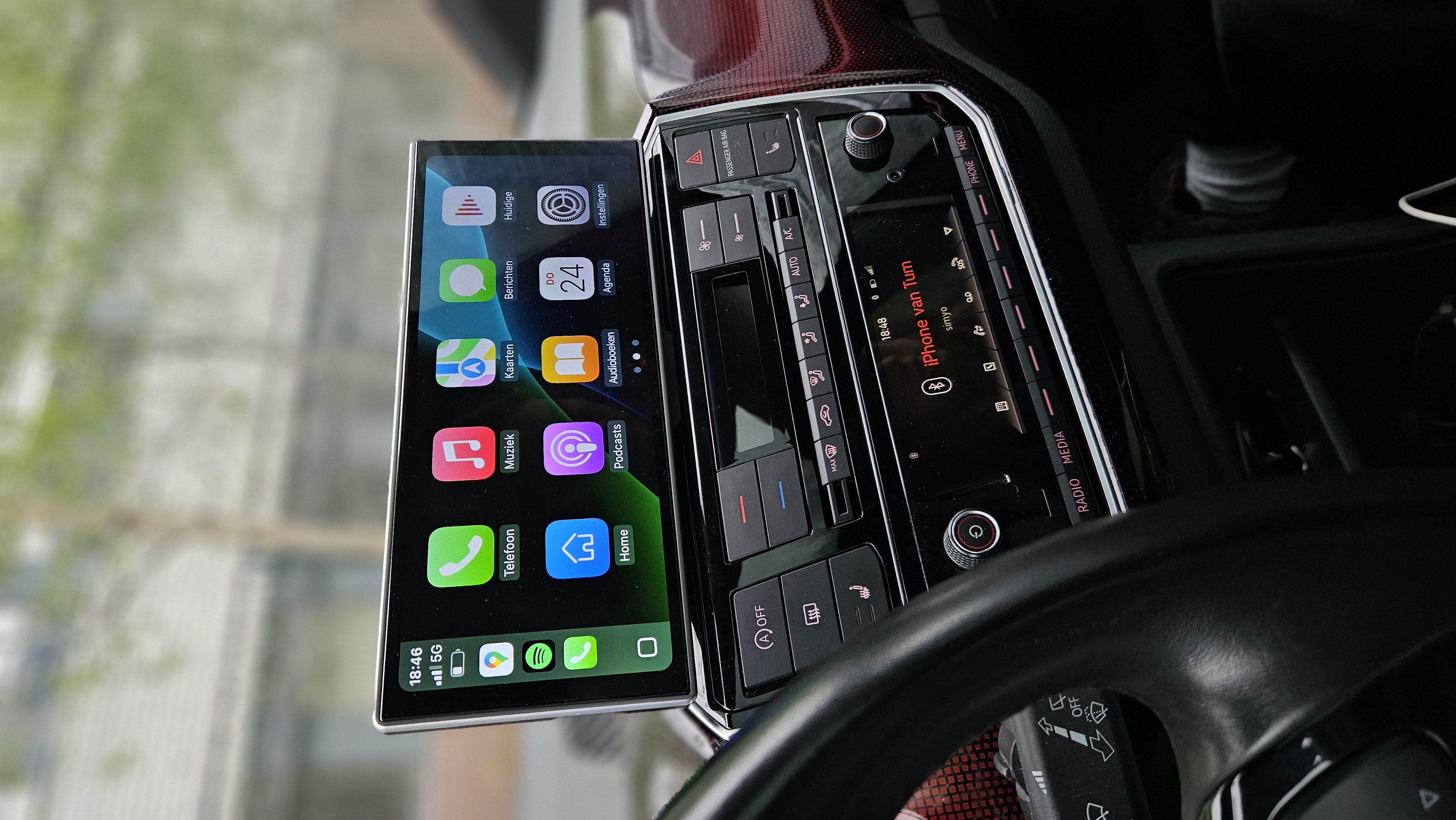 Ik ben nog op zoek naar een carplay systeem dat dit niet heeft. Op YT staat een filmpje van een gast die een carplay scherm gemonteerd heeft onder de radio, dat valt inderdaad minder op maar dan moet je steeds naar beneden kijken. Dat is niet ideaal.